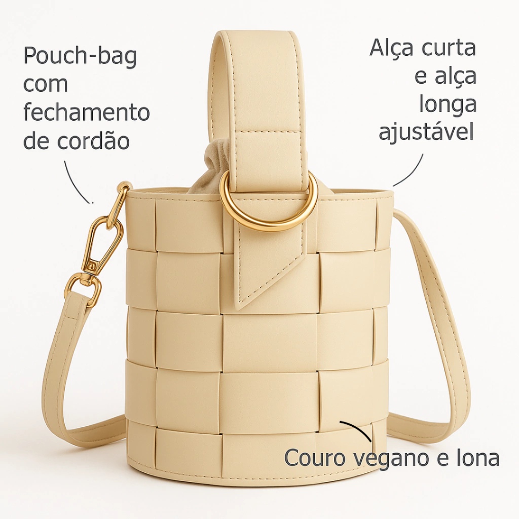 ▪️ Materiais: Couro vegano de alta qualidade, com acabamento em trama entrelaçada larga na parte externa. Parte interna (pouch-bag) com fechamento em tecido tipo lona com ajuste de cordão.