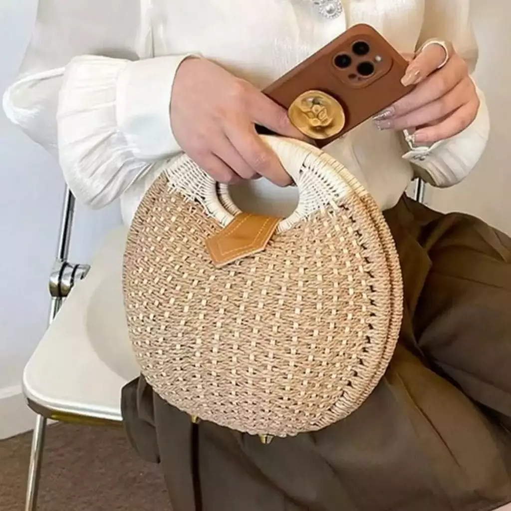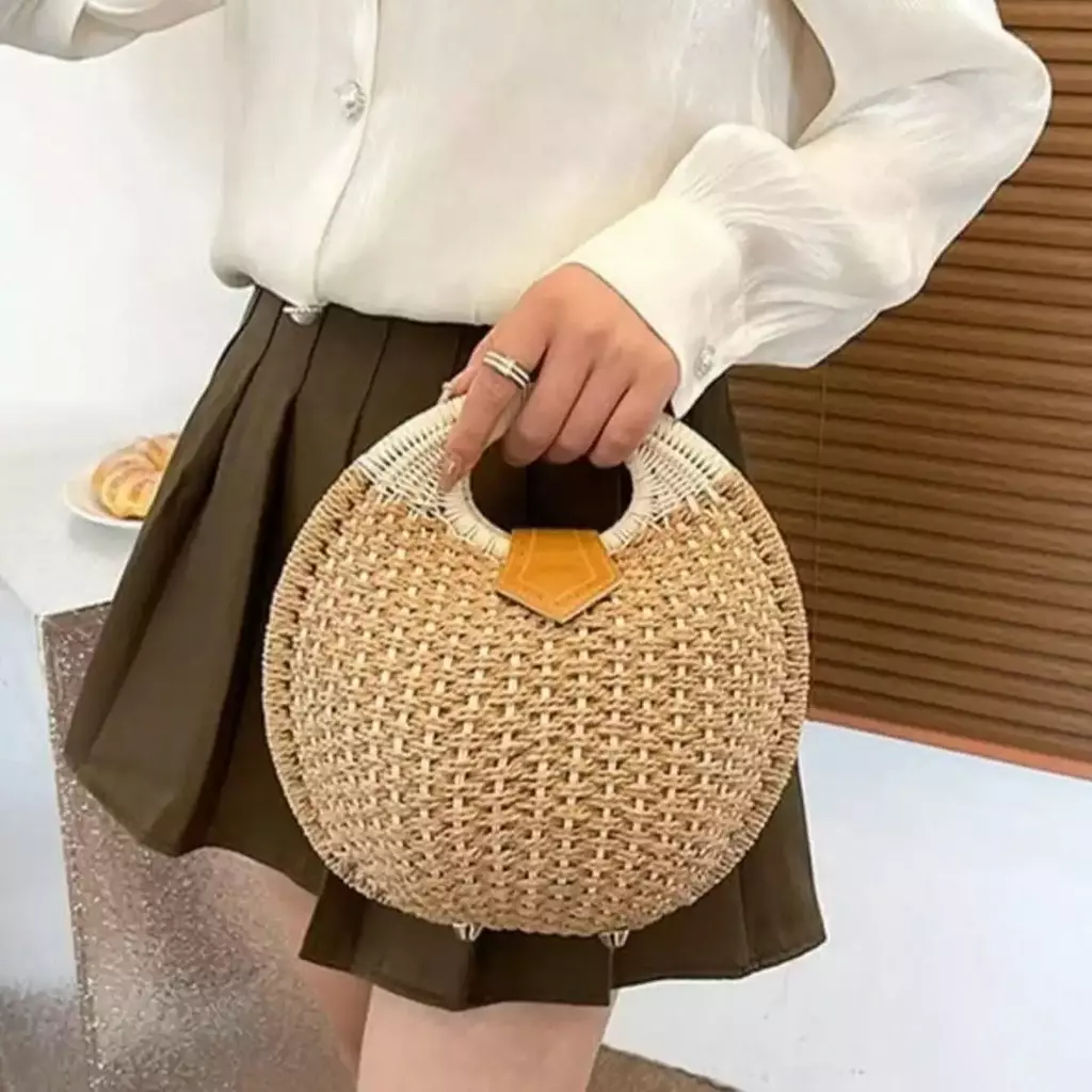 Uma peça do estilo natural da palha com o design moderno de formas arredondadas, seguindo a tendência artesanal e sustentável. Uma mistura de materiais como vime e couro ecológico traz modernidade e modernidade à moda praia e urbana atual.