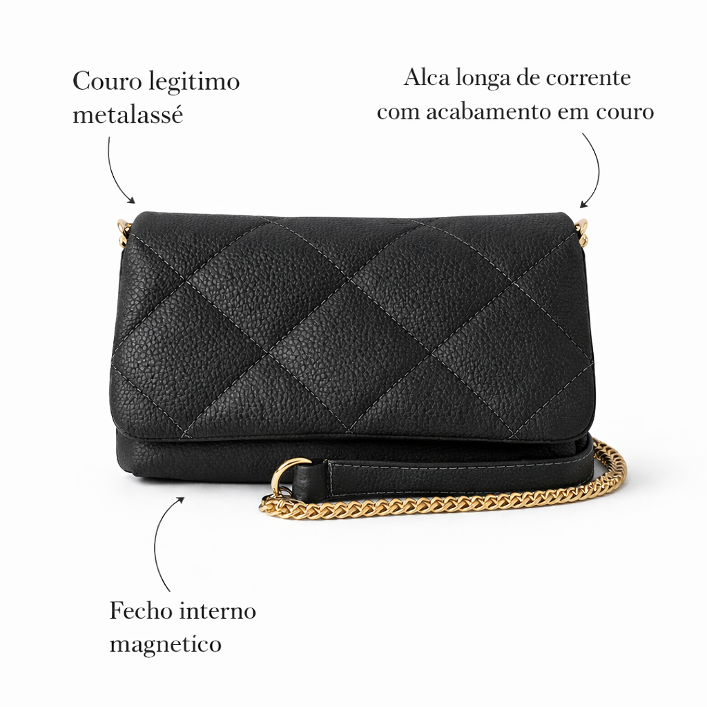 Essa peça é a tradução perfeita de luxo atemporal e versatilidade. Com um design estruturado e acabamento impecável, esta peça transita com facilidade entre o casual chic e produções de gala, sendo um acessório essencial para mulheres que não abrem mão de elegância e funcionalidade