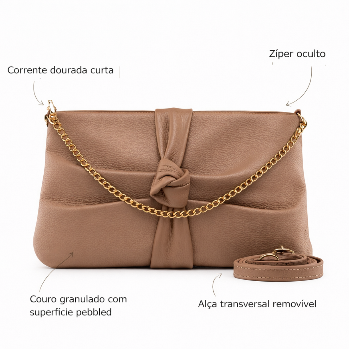 ▪️ Materiais: Couro granulado com superfície pebbled de granulação fina e uniforme. Acabamento matte com toque fosco sofisticado. Corrente dourada estilo grumetta em metal banhado a ouro envelhecido.