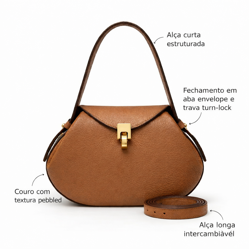 A peça materializa a forte tendência do Quiet Luxury e formas orgânicas. Seu design curvo e minimalista foca na excelência do couro e na ferragem dourada. A versatilidade das duas alças a torna uma peça statement que eleva produções urbanas com pura elegância atemporal.