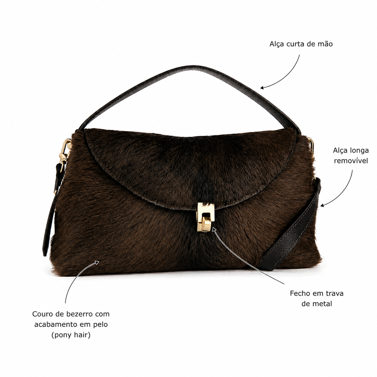 ▪️ Tipo de fechamento: Fechamento frontal por aba com trava em metal dourado polido. Os metais possuem banho especial de alta durabilidade, criando um contraste sofisticado com a textura orgânica do pelo.