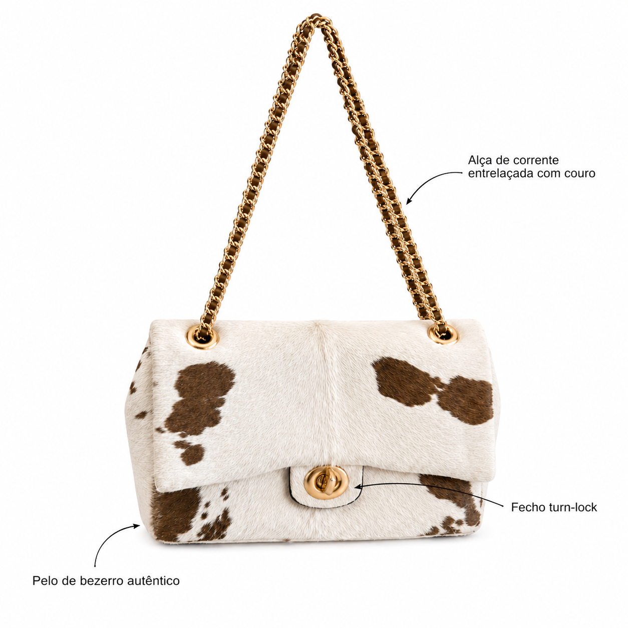 ▪️ Materiais: Confecionada em pêlo de bezerro autêntico (calfhair) com padrão de manchas naturais de vaca brancas e marrons. A textura é macia e tátil. O interior da alça e possivelmente os acabamentos são de couro marrom liso. O hardware é de metal dourado brilhante.