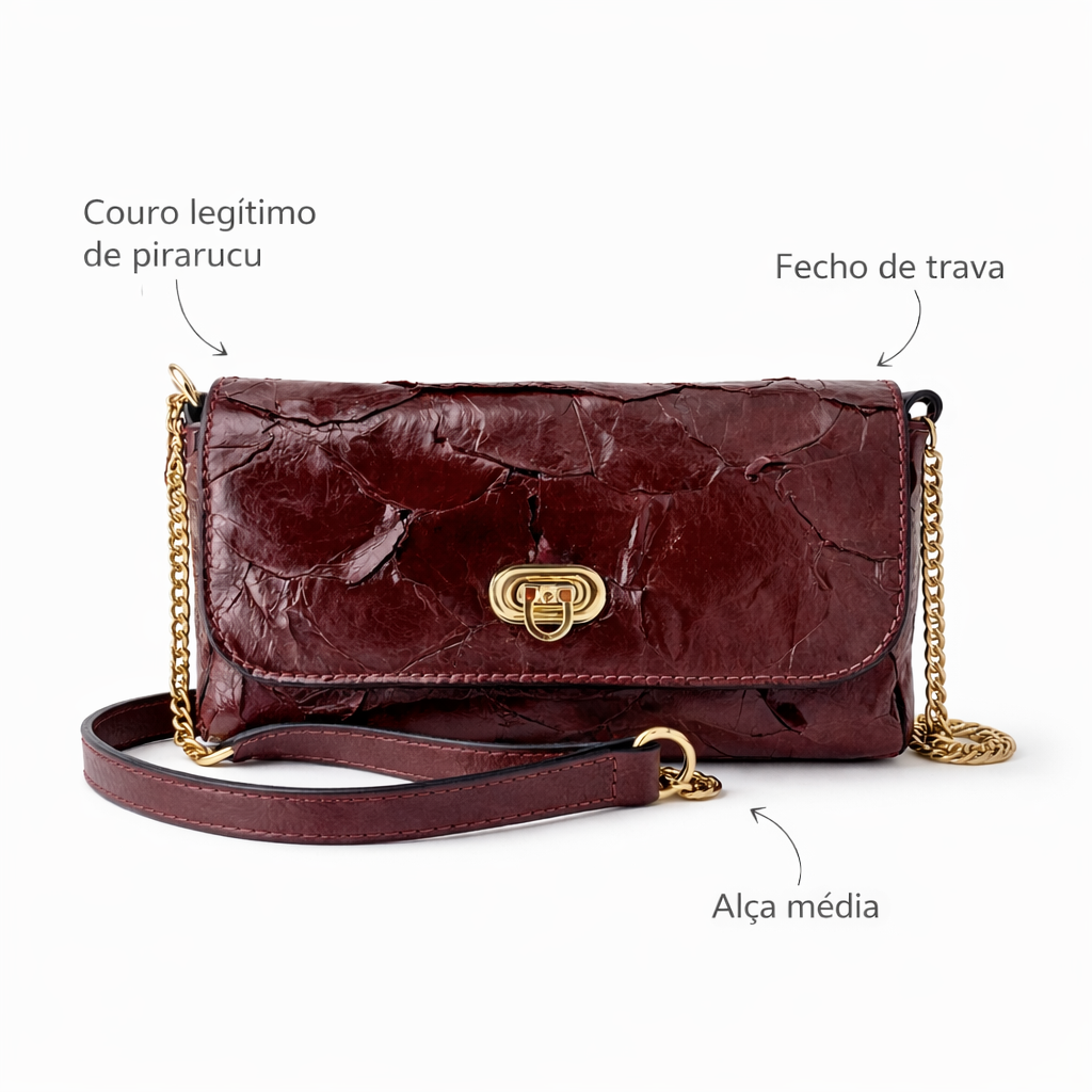 A peça une a tendência eco-luxury. O couro de pirarucu exótico e sustentável confere uma textura única, alinhando-se à busca por peças de slow fashion com história. O brilho metalizado e a corrente refletem o dopamine dressing, garantindo um acessório elegante e diferenciado.