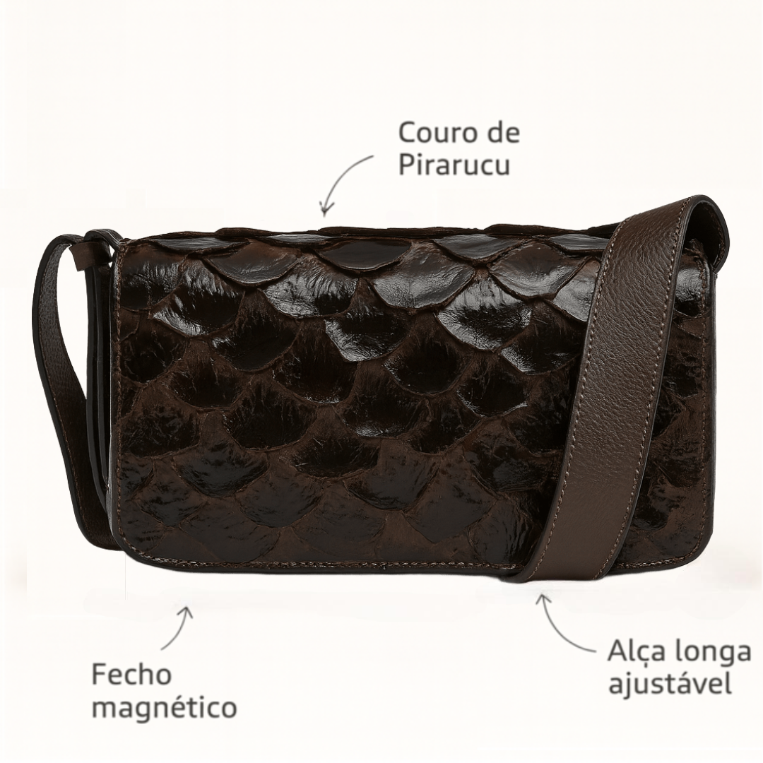 ▪️ Materiais: O corpo principal da aba (flap) é feito em Couro de Pirarucu de Escamas Exóticas (de manejo sustentável), oferecendo uma textura única e visualmente rica. O restante do corpo e a alça são em Couro Liso Legítimo. Possui uma discreta ferragem metálica dourada na lateral da alça.