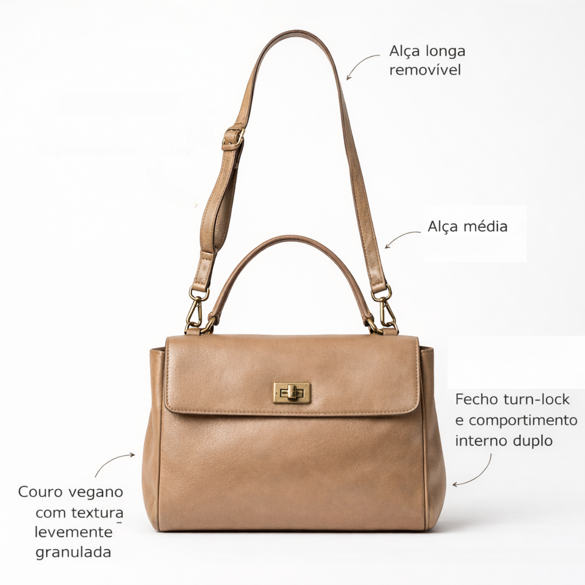 ▪️ Materiais: Couro vegano premium com textura levemente granulada e acabamento fosco em tom caramelo. Ferragens com banho em ouro envelhecido, que conferem um toque vintage refinado e resistente ao design sem o uso de logotipia excessiva.