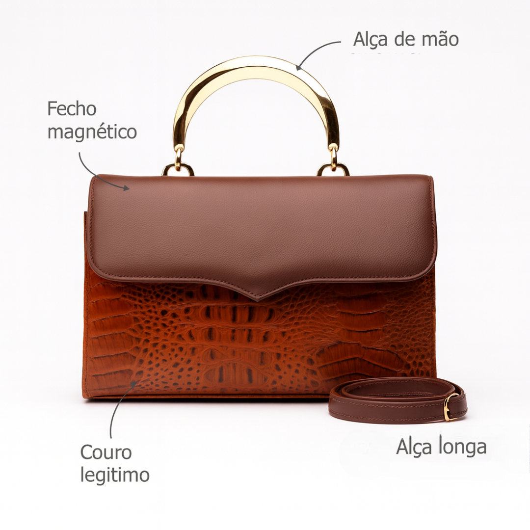 Essa peça traduz o charme parisiense aliado à força do design estruturado. Em couro croco e metais dourados, reflete a tendência das texturas luxuosas e do minimalismo elegante, símbolo de estilo e poder feminino na moda contemporânea.