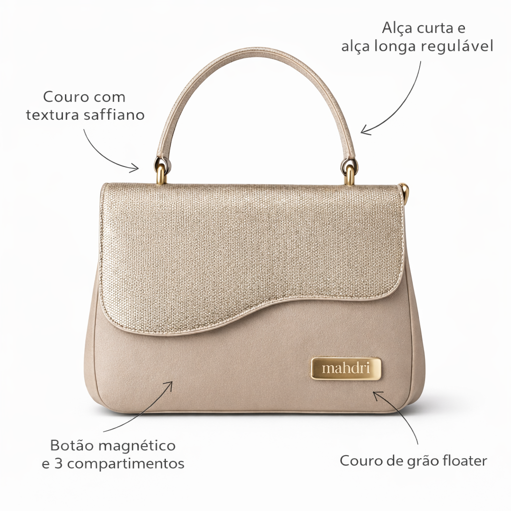 ▪️ Estilo das alças: Possui uma alça de mão superior para uso elegante na mão ou antebraço. Acompanha uma alça longa removível e ajustável, permitindo o uso transversal (crossbody) ou de ombro.
