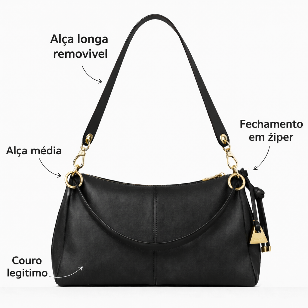 ▪️ Materiais: Couro genuíno com acabamento liso e toque macio. Leva elos metálicos conectando a alça, adicionando um ponto de luz sofisticado.