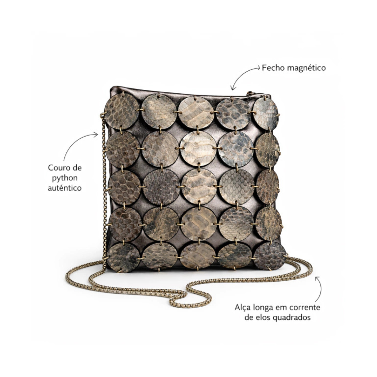 ▪️ Materiais: Confeccionada em couro de python autêntico, apresentando recortes circulares que expõem a textura exótica da pele. O acabamento possui um banho metalizado em tom níquel escuro, criando um contraste sofisticado entre a rusticidade natural e o brilho industrial.