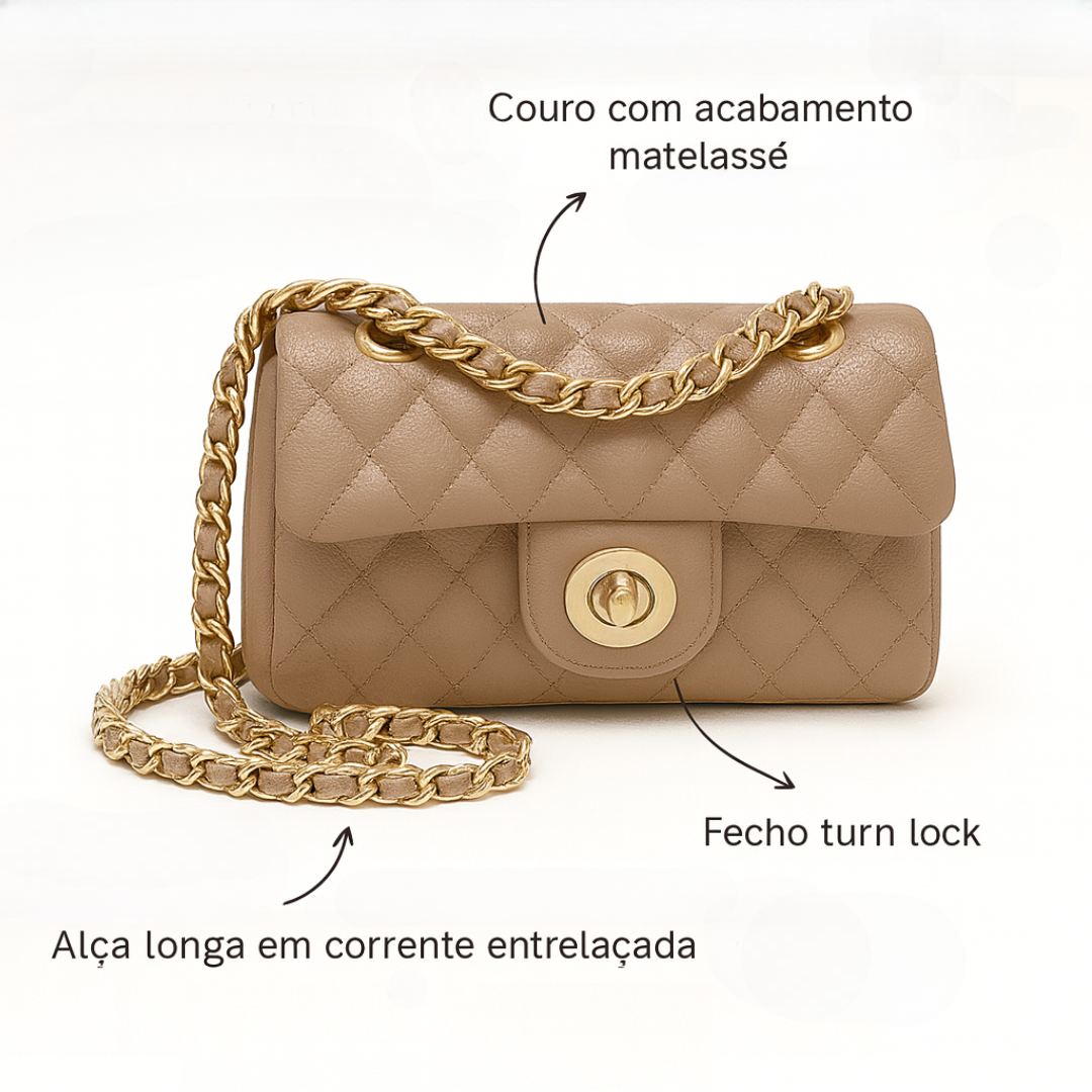 ▪️ Materiais: Couro de textura macia com acabamento matelassê sutil, costuras reforçadas e ferragens metálicas douradas de alto padrão.