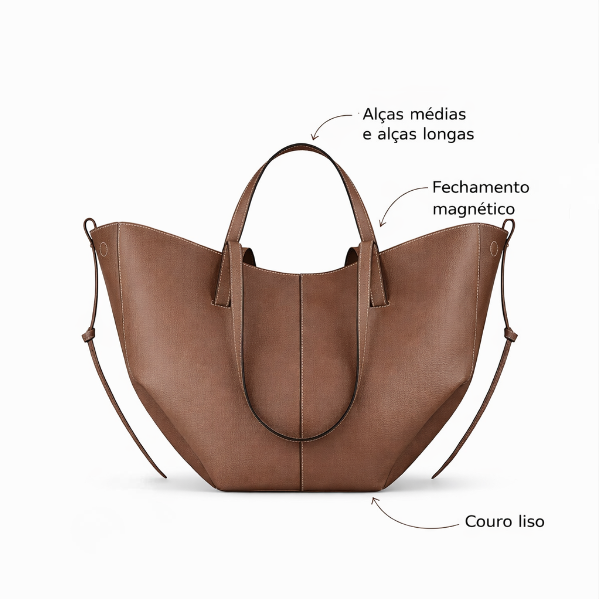 ▪️ Tipo de bolsa: Tote — bolsa de design orgânico e estrutura semi-rígida. O conceito traduz uma delicadeza romântica aliada à utilidade contemporânea, ideal para a mulher que busca fluidez e estilo europeu no dia a dia.