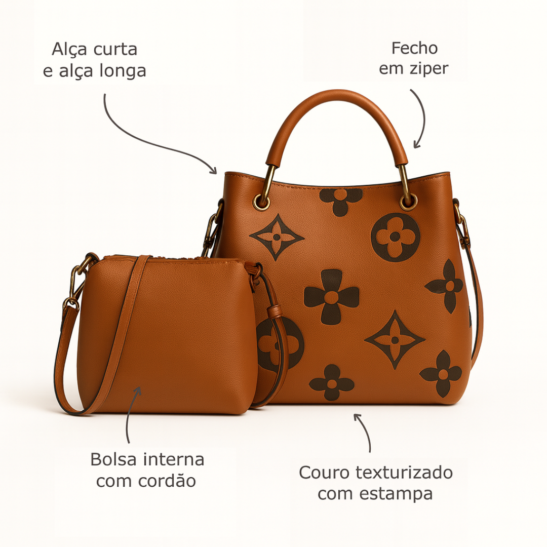 ▪️ Materiais: Couro texturizado com estampa em alto relevo floral em contraste escuro, conferindo sofisticação e identidade visual marcante.