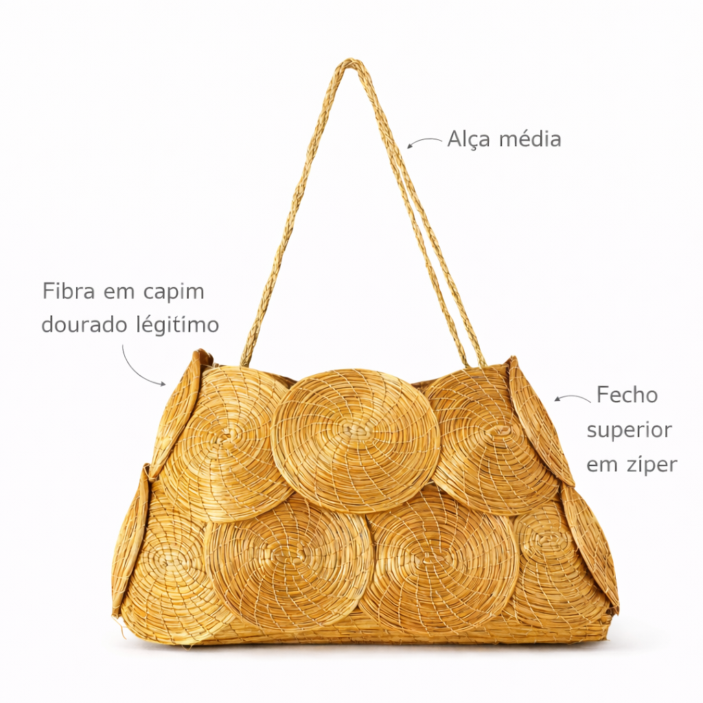 ▪️ Materiais: Confeccionada em legítimo capim dourado, costurado de forma 100% manual. O grande diferencial técnico é a textura tridimensional criada pela sobreposição dos discos circulares, evidenciando o brilho natural e o acabamento impecável do material.